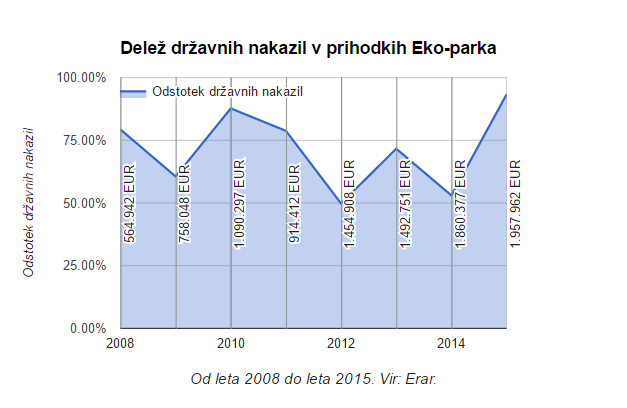 Povrhu krepko več kot pol vseh svojih prihodkov podjetje Eko-park dobi od države. Celotne prihodke in delež državnih nakazil po podatkih KPK prikazuje grafika: