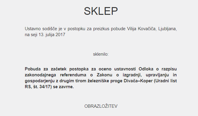 Ustavno sodišče je zavrnilo pobudo Vilija Kovačiča za oceno ustavnosti odloka o razpisu zakonodajnega referenduma o drugem tiru. Zavrnitev je izglasovalo sedem sodnikov, dva sta bila proti. Odločitev pomeni, da je dokončno jasno, da bo referendum 24 septembra.