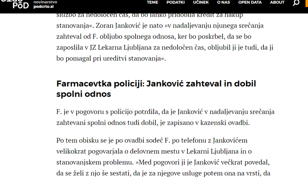 Portal Pod črto je pridobil in objavil podatke iz več kazenskih ovadb proti Jankoviću, med temi je tudi ovadba, kako bi naj v zameno za spolne odnose župan uredil stalno zaposlitev farmacevtki, ki se je ločevala.