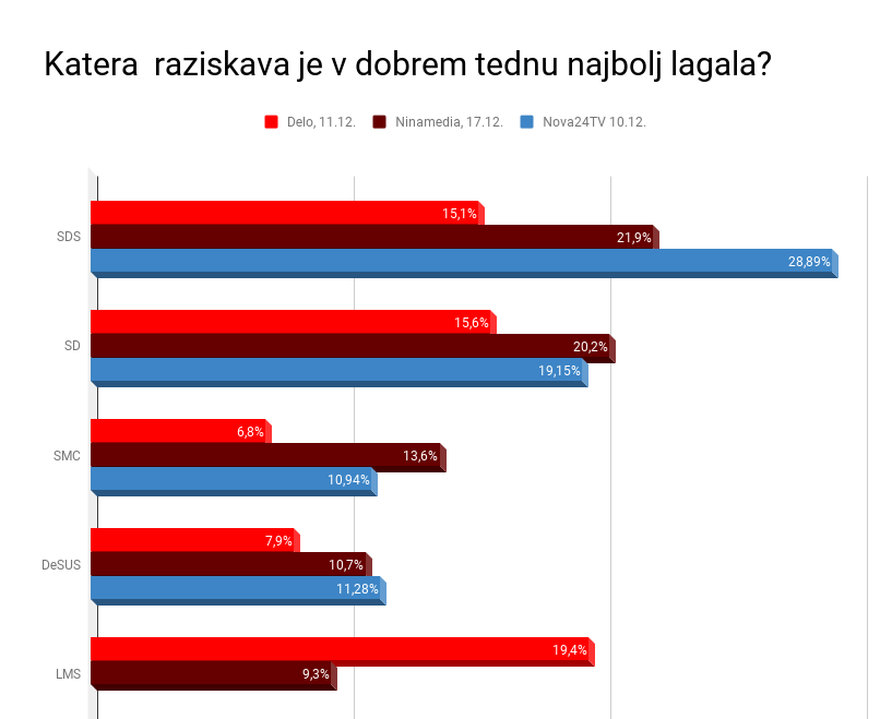 Od drugih (tudi preteklih) meritev izrazito odstopajo rezultati, ki jih je prejšnji teden objavil časopis Delo. Po preračunu njihovih podatkov z izločitvijo neopredeljenih, bi stranko Marjana Šarca volila skoraj petina volivcev, na drugo mesto Delo (že nekaj časa) pred SDS Janeza Janše uvršča SD Dejana Židana. To nedeljo je rezultate meritve Ninamedie objavila še nacionalna televizija. Ti se dramatično razlikujejo. Pravzaprav ne prvič. Moč LMŠ so pri Ninamediji merili tudi že pred mesecem in tudi takrat je bil delež za to stranko dramatično nižji kot pred tednom pri Delu. Zdi se, da si nekdo, skratka, izmišlja. Razlika ni le nekaj odstotkov ali nekaj deset odstotkov. Presega vse normalne možne statistične napake meritev.