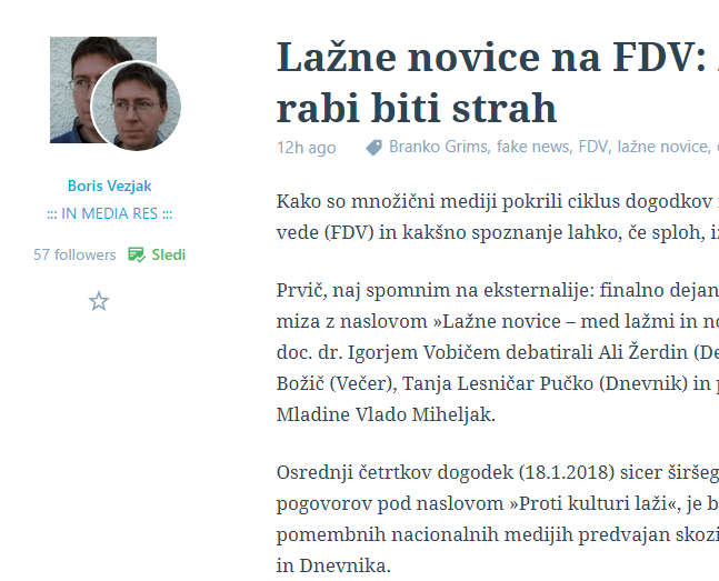 Boris Vezjak se je na svojem blogu ostro odzval na medijske odzive z desnice na prireditev na FDV o Fake News. S tem dogodkom se kaj posebej nisem ukvarjal. Opazil pa sem živahne spletne komunikacije, v katerih je bilo omenjeno, da me tja niso vabili, čeprav sem pravkar izdal knjigo o tem, v kateri predstavljam vrsto povsem konkretnih primerov lažnivih novic v največjih slovenskih medijih in tudi opišem, kako so te manipulacije nastale in zakaj so bile objavljene.