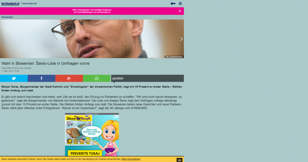 “Ne maram ekstremistov, ki vidijo samo črno-bele stvari. Življenje je pisano,” je v pogovori za Der Standard župan Kamnika Marjan Šarec povedal, zakaj po volitvah ne bo sklepal koalicije s SDS Janeza Janša. S Šarcem ni pričakovati resne spremembe politike države, ocenjuje avstrijski časopis, koalicijsko sodelovanje s SDS Janeza Janše Šarec zavrača, v Sloveniji pa ima že dalj časa večino leva sredina. Der Standard v Avstriji uvrščajo bolj na levo sredinsko stran medijskega spektra.