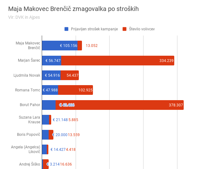 Predsedniško kampanjo je med vsemi daleč najbolj zavozila SMC, ki je za promocijo svoje kandidatke porabila 105.156 evrov. Za kampanjo so v SMC za ministrico za izobraževanje Majo Makovec Brenčič porabili krepko več kot sta skupaj potrošila Borut Pahor in Marjan Šarec v obeh krogih. A pri Maji Makovec Brenčič tudi ta denar in Igor Arih, ki je pomagal v kampanji, nista zalegla. Kljub visokemu vložku je dosegla šele sedmi rezultat med devetimi kandidati, volilo jo je vsega 1,7 odstotka glasujočih. Primerjava vloženega denarja vseh kandidatov in števila volivcev na predsedniških volitvah je takšna: