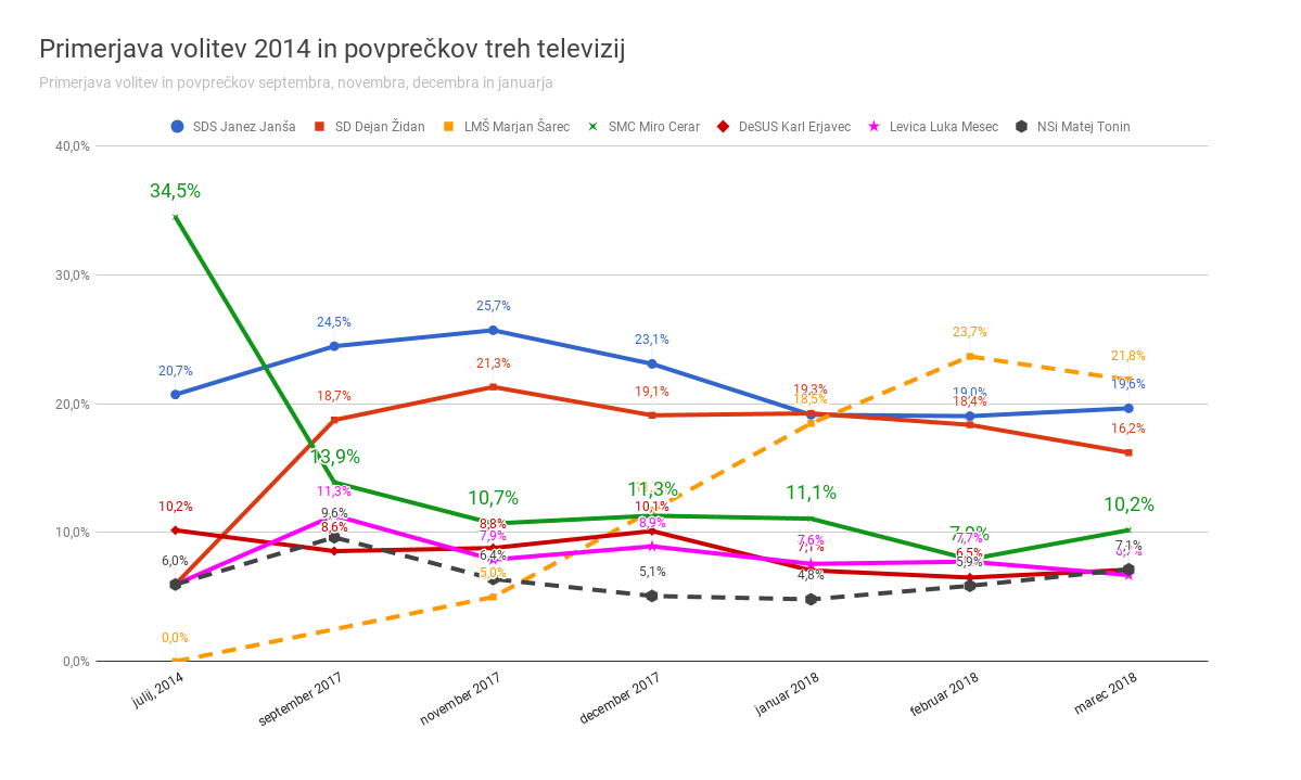Ocene, da je odstop premiera, posledica so bili Cerarjevi nastopi v številnih medijih, povzročil radikalen preobrat v javnem mnenju, so se po rezultatih raziskav, ki sta jih doslej predstavili TV Slovenija in POP-TV pokazale za pretirane. Meritev, ki jo agencija Parsifal SC izvaja za NOVO24TV, je nastala pred Cerarjevim odstopom. Po nobeni od teh raziskav SMC ni med prvo trojko, ki je rezervirana za LMŠ Marjana Šarca, SDS Janeza Janše in SD Dejana Židana. Odstop vlade je – tako kaže – škodoval najmanjši vladni stranki SD, trend je zadnje mesece obrnjen navzdol. Ustavil pa se je tudi vzpon stranke Marjana Šarca, ki je zadnji mesec izgubila približno tisto, kar je pridobila SMC. Primerjava nihanja podpore velikim strankam (ki jim meritve kažejo več kot štiri odstotke) v zadnjih mesecih, ki jo naredim tako, da za vsak mesec izračunam povprečje raziskav treh televizij, na začetku pa prikažem rezultat volitev leta 2014, je takšna:
