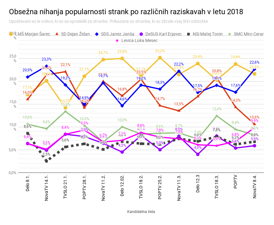 Iz rezultatov različnih raziskav sem, da jih lahko primerjamo medsebojno (in z volitvami), izločil strankarsko neopredeljene odgovore, torej ne vem, ne bom voli. Deleže pa sem preračunal in jih sorazmerno zbranim odstotkom strank med opredeljenimi prerazporedil. V grafiki je zaradi preglednosti izpuščena množica manjših strank, ki so pod pragom za vstop v parlament.