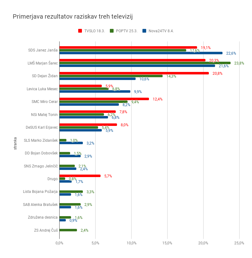 Na enak način narejena primerjava rezultatov objavljenih raziskav treh televizij, ki vsebuje tudi manjše stranke, pokaže podobno neverjetno različne rezultate tudi pri najmanjših strankah, ki se borijo za vstop v državni zbor. Razlike še poudari, ker Ninamedia za TVSLO prikazuje le parlamentarne stranke in Listo Marjana Šarca, ostale pa vse kar združijo v “drugo”. Takšna je primerjava rezultatov treh televizij, vrstni red je izbran po zadnji raziskavi za Novo24TV: