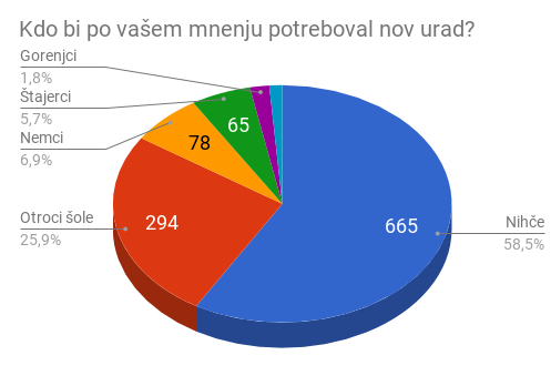 O smiselnosti novega uradu za narode SFRJ v Sloveniji je že od objave članka z naslovom “DZ: DISKRIMINATORJI KATOLIKOV PREDVOLILNO “REŠUJEJO” NARODE SFRJ” mogoče odgovoriti v anketi in velika večina bralcev Spletnega časopisa je bila doslej odločno proti posebnemu uradu za narode SFRJ. Bi ga pa pa četrtina glasujočih ustanovila za otroke, ki jih diskriminirajo poslanci. Rezultat je bil doslej takšen: