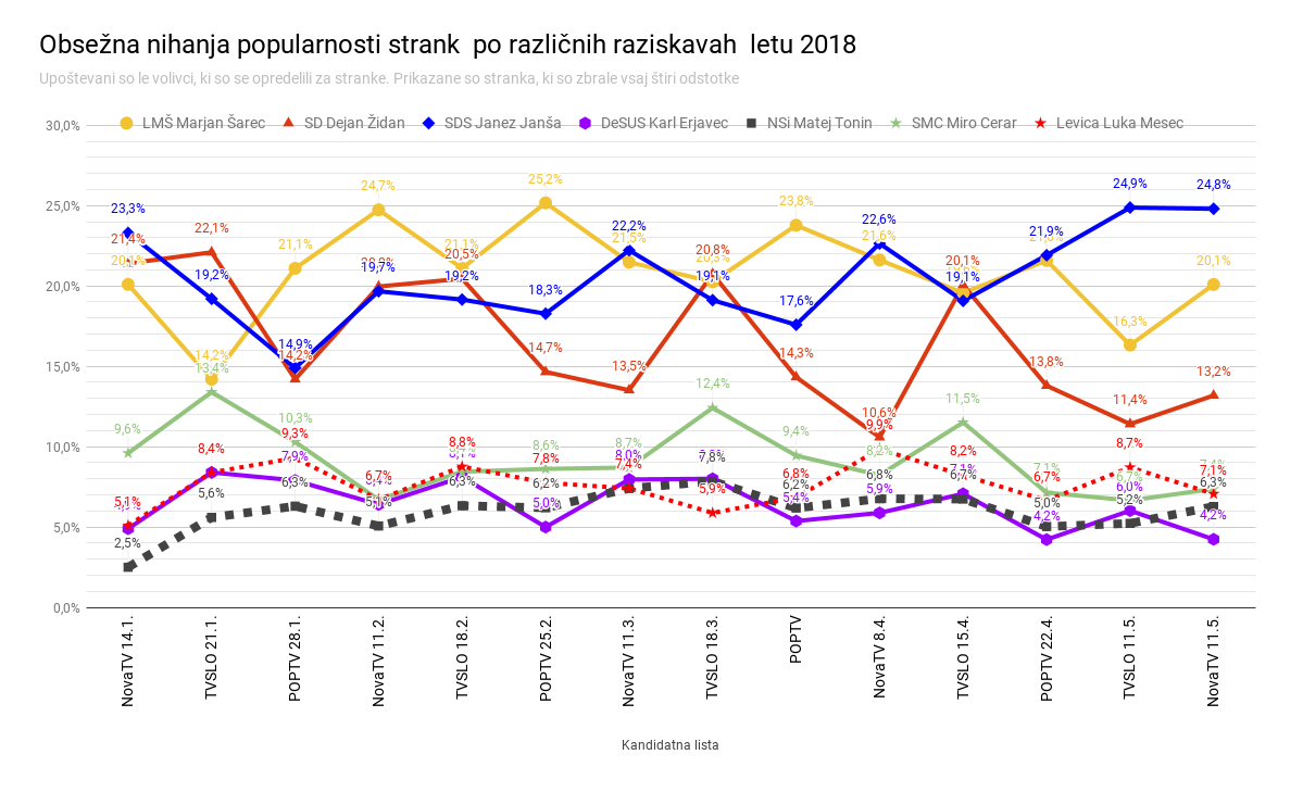 Najbolj popularna stranka v državi je po obeh raziskavah SDS Janeza Janše, sledi LMŠ Marjana Šarca, na tretjem mestu je SD Dejana Židana. Da Židan in Šarec kar krepko zaostajata za Janšo kaže raziskava javne televizije, ki jo v zadnjem mesecu pred volitvami dela Mediana in ne več Ninamedia kot jih je prej. Po Parsifalu SC, ki tradicionalno meri za Novo24TV, razlike med tremi strankami na vrhu niso bile in niso tako velike. Spopad bo še napet, nakazujejo rezultati te raziskave. Raziskavam ni dobro preveč verjeti. Praviloma zgrešijo celo, ko rezultat napovedujejo v tednu pred volitvami in pogosto je slišati, da so bolj oblika ustvarjanja kot merjenja javnega mnenja. Iz rezultatov obeh raziskav sem, da ju lahko primerjamo medsebojno (in z volitvami), izločil strankarsko neopredeljene odgovore, torej ne vem, ne bom voli, ne grem na volitve. Te deleže sem sorazmerno zbranim odstotkom strank prerazporedil. Za največje stranke je rezultat v primerjavi z volitvami leta 2014 tak: