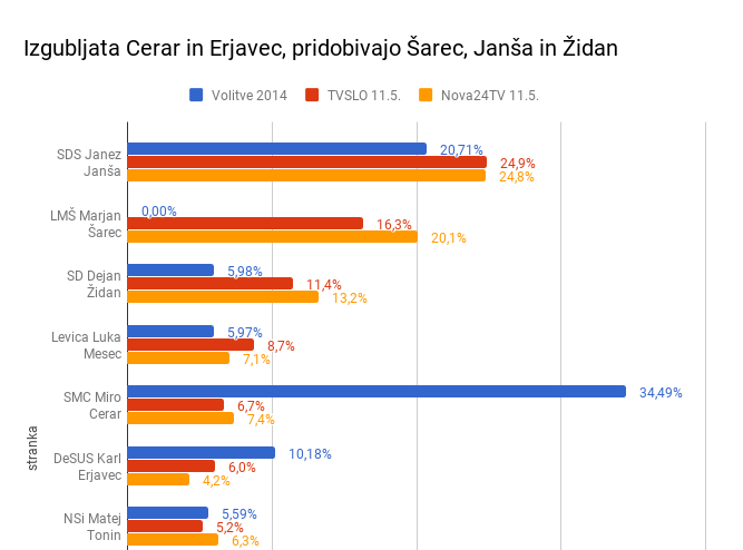 TV Slovenija in Nova24TV sta včeraj objavili rezultate raziskav javnega mnenja, ko se je čas uradne volilne kampanje ravno dobro začel. Obe kažeta, da lahko v primerjavi s prejšnjimi volitvami prava katastrofa doleti največji vladni stranki SMC Mira Cerarja in Desus Karla Erjavca. Cerarju odstopanje vlade, ko je sodišče odločilo, da bo zaradi goljufanja vlade v nedeljo ponovljen referendum, ni veliko pomagalo. Pobudnik referenduma in sporov pred vrhovnim in ustavnim sodiščem Vili Kovačič kandidira na listi novinarja Bojana Požarja. Glasove bo zbiral v istem okraju kot Karl Erjavec. Za Erjavca se zdi malo verjetno, da bi ga lahko dvignili nenadno predvolilno povezovanje z Zoranom Jankovićem, ki sploh ne kandidira. Za druge večje stranke raziskavi kažeta, da se v primerjavi z volitvami pred štirimi leti krepijo. Najbolj najmanjša vladna stranka SD Dejana Židana, raste pa tudi največja opozicijska stranka SDS Janeza Janše.