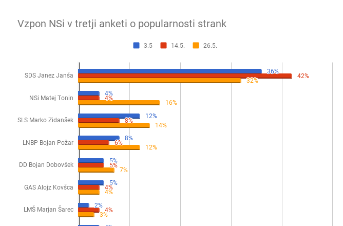 V tretji zaporedni anketi o priljubljenosti strank Spletnega časopisa se je na vrhu nenadoma ob SDS Janeza Janše pojavila NSi Mateja Tonina, ki je bila v prvih dneh anketah nekoliko presenetljivo skoraj brez glasov bralcev. To je bilo nenavadno, ker je precej jasno, da se ankete udeležujejo nekoliko bolj desno usmerjeni bralci in če NSi ne bi bilo močna med temi, bi bilo veliko vprašanje, kaj lahko ta stranka doseže na volitvah. Zadnje dni se krepi tudi podpora Listi Novinarja Bojana Požarja in SLS Marka Zidanška, velika prednost SDS pa se zato nekoliko topi. Rezultati ankete nikakor niso napoved razpleta volitev in namen tudi ni napovedati, kak bo rezultat. Kažejo pa odgovori stališča bralcev Spletnega časopisa. Kot urednik podpiram stranke, ki jih podpira največ bralcev. Za zdaj jih največ podpira SDS. Tisti, ki jih zanimajo rezultati raziskav javnega mnenja, ki poskušajo napovedati rezultat volitev, lahko več o tem najdejo tukaj https://spletnicasopis.eu/category/raziskave-javnega-mnenja/.