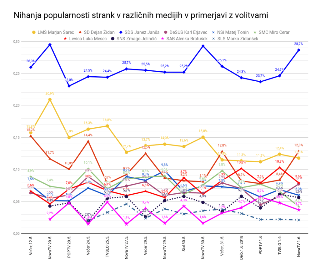 Po vseh raziskavah je zadnji dan pred volilnim molkom, ko mediji praviloma več ne objavljajo raziskav javnega mnenja, precej odločno vodila SDS Janeza Janše. A ker ni jasno, kakšna bo udeležba, tudi tretjina anketiranih pa je še neodločena, lahko SDS primat tudi še celo zgubi ali pa prednost poveča. Odvisno bo od volivcev na voliščih v nedeljo. Manj jasen je položaj nižje, kjer se po različnih raziskavah izmenjujejo LMŠ Marjana Šarca, SD Dejana Židana in celo Levica Luke Meseca. Razlike niso velike.