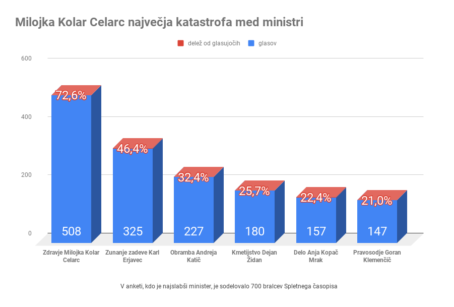 Največja katastrofa v zadnjem mandatu je bila ministrica za zdravje Milojko Kolar Celarc. Od 700 bralcev spletnega časopisa, ki so odgovarjali na anketo, jo je kar 508 izbralo za eno od treh najslabših ministrov. To je tako slab rezultat, da kaže že, da je dosedanji premier Miro Cerar (SMC) storil resno napako, ker je lani ni odstavil. Skoraj karkoli bi bilo bolje, če sodimo po rezultatu. Anketirani so lahko izbrali tri najslabše in najboljše ministre. Trije ministri, ki Milojki Kolar Celarc sledijo po številu ocen, da so bili najslabši, nam bodo še naprej vladali.
