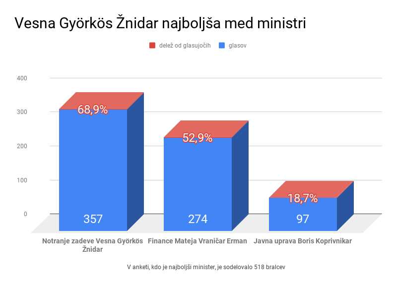 Obratno je pri najbolje ocenjenih, kjer je na vrhu z veliko prednostjo notranja ministrica Vesna Györkös Žnidar. Kar 68,9 odstotka glasujočih jo je uvrstilo med tri najboljše. Z več kot polovično podporo vseh glasujočih ji sledi Mateja Vraničar Erman, na tretjem mestu, a z že manj kot petinskim deležem, je minister za javno upravo Boris Koprivnikar. Od treh najbolje ocenjenih ministrov v vladi Marjana Šarca, ki danes prisega, ne bo ostal nobeden. Odziv na anketo o najslabših ministrih je bil boljši kot o najboljših. O najslabših je glasovalo 700 bralcev, za najboljše 518. Grafično so trije največkrat najbolje ocenjeni ministri dosegli takšen rezultat.