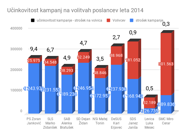 Za kampanjo pred volitvami poslancev je dramatično neuspešno denar trošil Desus Karla Erjavca. Po poročilu, ki ga je podpisal Branko Simonovič, je Desus porabil 354.637 evrov, volilo pa jih je le 43.889 volivcev. Če preračunamo: vsak glas volivca jih je stal 8,3 evra. To je med strankami doslej daleč najslabši rezultat. Erjavec bi skoraj dohiteli “dosežek” Pozitivne Slovenije Zorana Jankovića pred štirimi leti, ki jo je glas volivca stal kar 9,4 evra. Po še neuradnih informacijah je mogoče, da bo še bolj katastrofična slika kot pri DeSUS pokazalo poročilo SLS, ki jo je v času volitev vodil Marko Zidanšek.