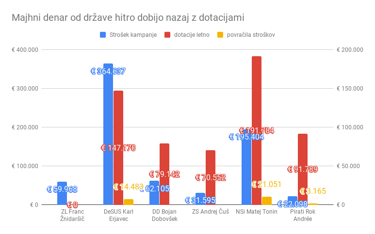 Še hitreje kot Čušu bo država z dotacijami stroške kampanje povrnila Piratom, ki bodo za 2,15 odstotka glasujočih dobijo tudi delno povračilo stroškov kampanje. To povračilo bodo večje stranke dobile, ko njihovo poslovanje in poročanje o kampanjah v prihodnjih mesecih oceni računsko sodišče. Dotacije, ki so pa veliko pomembnejši vir denarja za delovanje strank, že dobivajo vsak mesec od dneva volitev.