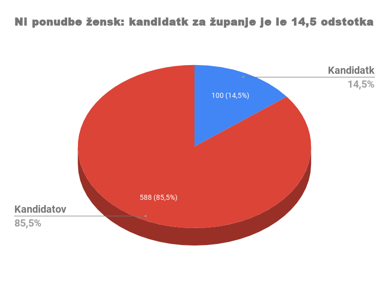 Od sto kandidatk jih petnajst predlaga SDS, enajst SD, šest SLS, štiri SMC, štiri DeSUS, tri SNS, tri Levica, dva LMŠ in eno NSi. Največ, 42, pa jih kandidira nestrankarsko. Le ena, Mojca Čemas Stjepanovič, je koalicijska županska kandidatka. Predlagala sta jo skupaj DeSUS in SD. V 36 občinah je po sicer še neuradnih podatkih le en kandidat in so tam torej župani že izvoljeni. Med temi je tudi ena predstavnica nežnejšega spola: v Majšperku Darinka Fakin, ki jo je predlagala SLS. Spisek občin, kjer je en sam kandidat, je že dalj časa nespremenjen, imena vseh že izvoljenih županov lahko preberete v povezanem članku tukaj: 2018/10/26/ponovno-je-izvoljenih-26-zupanov/