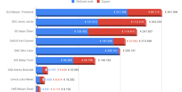 300.000 evrov težko kampanjo napovedala SDS, ki je najela posojilo. Sledita DeSUS in SMC. SD s pol manj kot SDS, nižji zneski Levice, LMŠ in SNS.