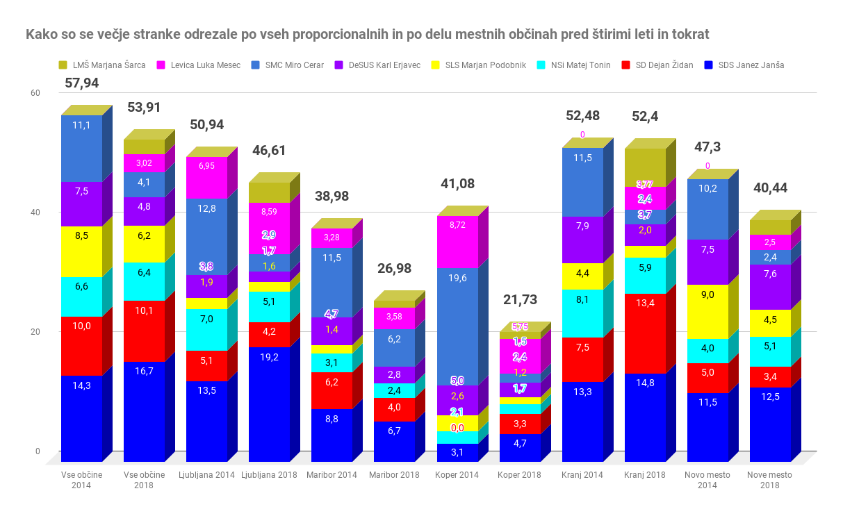 Obratno se jim je zgodilo v Mariboru, kjer so se iz spopada za županski položaj umaknili s podporo Francu Kanglerju. Tam so rezultat poslabšali. V obeh največjih mestih se je slabo odrezala SD Dejana Židana, ki je krepko poslabšala rezultata in ima v teh dveh velikih urbanih okoljih tudi več kot pol nižje deleže kot v povprečju v vseh občinah. V Ljubljani je SD prehitela celo NSi Mateja Tonina. Glasove je SD pobira lista Zorana Jankovića, v Mariboru pa najbrž listi Saše Arsenoviča in Andreja Fištravca. Obe sta krepko prehiteli SD. Arsenovičeva je s 21 odstotki dosegla celo relativno zmago pred listo Franca Kanglerja s 18,5. V Ljubljani si je Jankovičeva lista s 42,4 odstotki zagotovila večino v mestnem svetu in lagodno vladanje za Jankovića. Strankarsko so bili, prikazana je primerjava z letom 2014, rezultati osmih največjih strank na ravni vseh občin s proporcionalnim sistemom in v nekaj večjih mestih takšni (s klikom lahko grafiko povečate):