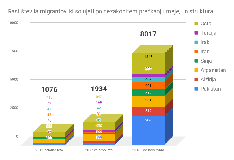 V letošnjem letu so do 31. oktobra policisti opazili 8.017 ilegalnih prehodov državne meje. Lani do konca oktobra 1.502 ilegalnih prehodov. Koliko je migrantov, ki se povsem izmaknejo policiji, in jih ne opazijo niti, ko jim že uspe priti na čez mejo, ne vemo. Število najdenih se je glede na enako obdobje preteklega leta povečalo za 433,8 odstotkov, so izračunali na policiji. Sosednjim državam so naši policisti letos doslej vrnili 3.962 tujcev, torej skoraj polovico tistih, ki so v državo v tem času prišli “na črno”. Lani v enakem času so vrnili 599 tujcev. Največ, 3.853 migrantov, je bilo vrnjenih Hrvaški, med temi je bilo največ državljanov Pakistana in sicer 1.427. Pakistancev je tudi največ med tistimi, ki se letos v državo tihotapijo mimo mejnih prehodov, ograje in policistov. Podatki, da je naša meja vse bolj odprta, so takšni: