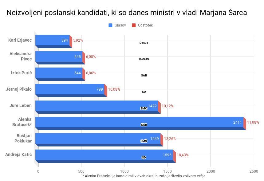 Premierov državni sekretar Uroš Prikl (DeSUS) je na volitvah poslancev s 443 glasovi zbral le glas volivca več kot Vilfan. Nekdanja ministrica za delo Anja Kopač Mrak (SD) v okraju Ljubljana Center ni bila izvoljena s 1.218 glasovi, Vojmir Urlep (LMŠ) pa v Kopru ne s 1.342 glasov.