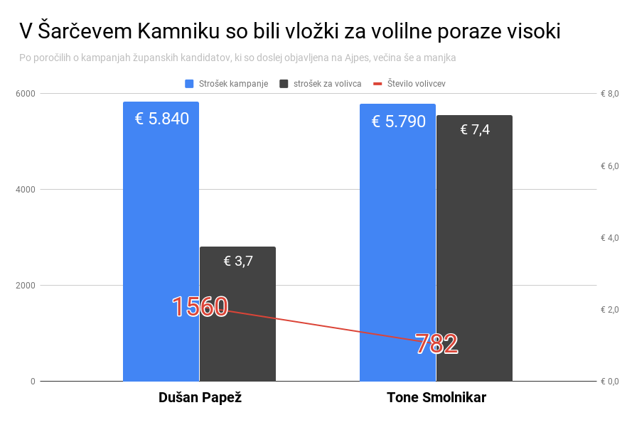 Kamnik je s 23.524 volivci relativno velika občina. Zakonska omejitev koliko smejo v prvem krogu za kampanje največ porabiti županski kandidati je bila za to občino 5.881 evrov. Papež in Smolnikar sta šla skoraj do limita. In propadla.