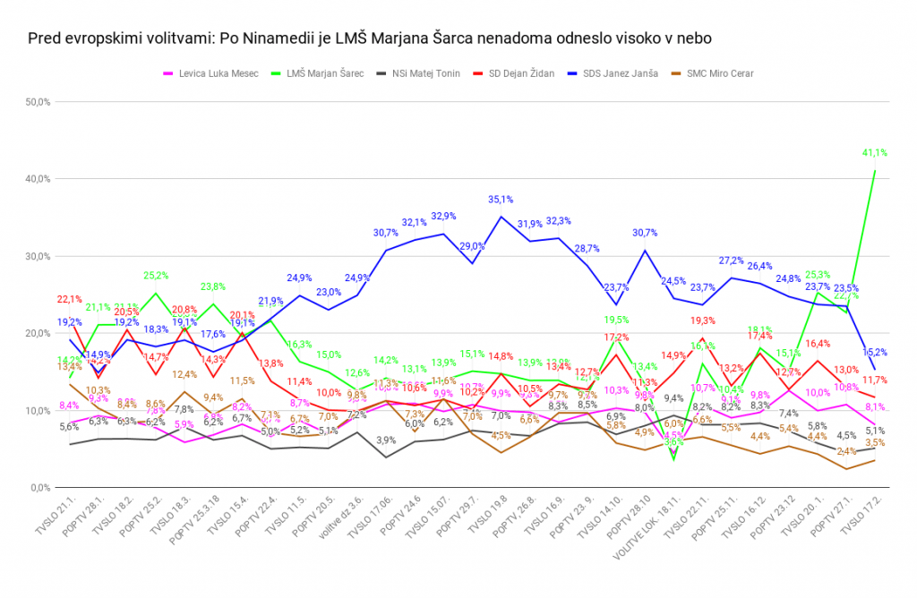 Če upoštevamo le za stranke opredeljene volitve, kar omogoča primerjavo z volitvami in drugimi raziskavami, bi po Ninamedii LMŠ volilo kar 41,1 odstotka volivcev. SDS Janeza Janše, ki je na volitvah poslancev junija lani zbrala daleč največji delež, pa 15,2 odstotka. Primerjava podatkov, ki jih je objavila javna televizija, z zadnjo raziskavo Mediane za POPTV, pri obeh upoštevam le za stranke opredeljene volivce, je takšna: