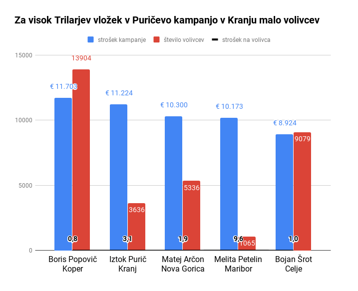 Čeprav to ne piše, je precej gotovo, da je bilo 11.224 evrov porabljenih za kampanjo zdaj ministra Puriča, ki se mu pa s to vsoto ni uspelo uvrstiti v drugi krog, kjer sta se v Kranju pomerila poznejši zmagovalec Matjaž Rakovec (SD) in Zoran Stevanović. Purič je s 18,32 odstotki v prvem krogu dosegel tretji rezultat. Najvišja dovoljena vsota za kampanjo v prvem krogu je bila le dobrih sto evrov višja od prijavljene porabe: 11.335 evrov. Trilar za župana sam ni ponovno kandidiral, na volitvah svetnikov pa je nastopil v koaliciji s SAB. Primerjave s stroški drugih kandidatov po državi kažejo, da je bila Puričeva kampanja doslej za kampanjo Borisa Popoviča druga najdražja, a večina kandidatov iz velikih mest še ni poročala. Denar pri Puriču ni zelo učinkoval, 3,1 evro kampanje za dobljenega volivce je relativno slab rezultat. Matej Arčon je z manj denarja v Novi Gorici prepričal precej več volivcev: