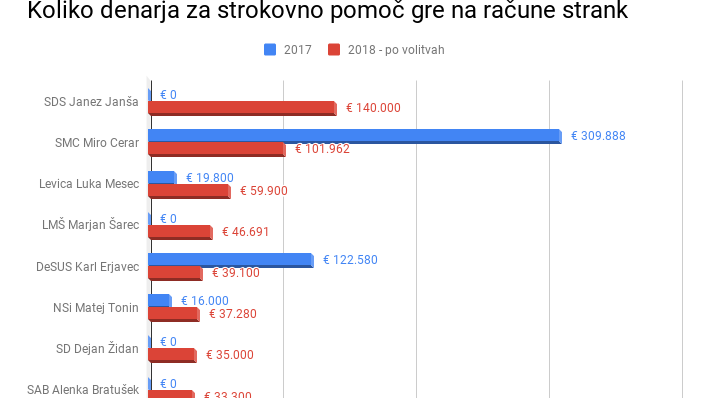 Izjema, ko gre za nakazila po volitvah, sta poraženki volitev SMC in DeSUS, ki se jima je vsota, ki jo smeta porabiti za strokovno pomoč dramatično zmanjšala in sta si zato precej manj nakazovali. Namesto 46 imata od volitev v seštevku le še 15 poslancev in temu ustrezno manj denarja za zaposlovanje v DZ in nakazila na račune strank.