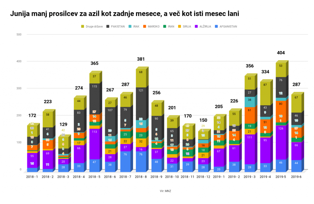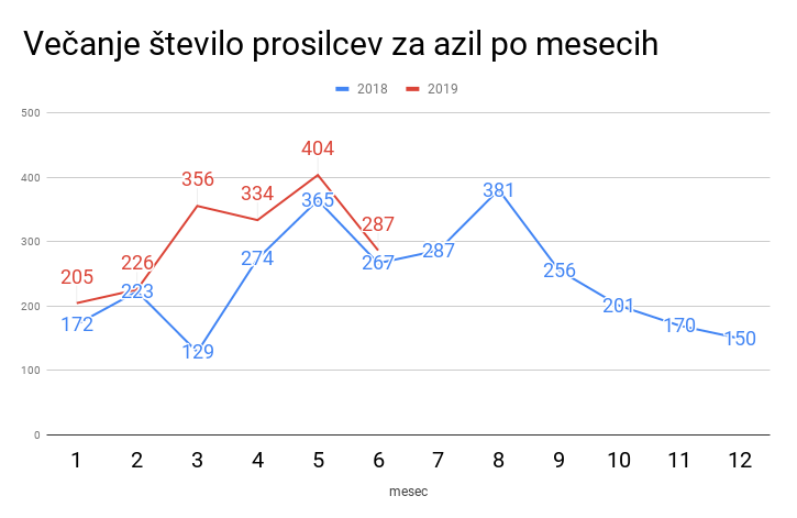 Tudi junija se je v primerjavi z istim mesecem lani povečalo število prosilcev za azil. V prvih šestih mesecih letos jih je bilo vsak mesec več kot lani. Letos v pol leta je bilo v seštevku za azil prosilo 1762 migrantov, lani 1430. To kažejo statistični podatki, ki jih je ta teden objavilo notranje ministrstvo.