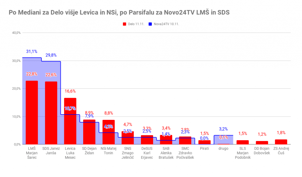 Precej izenačeni čisto na vrhu pa sta po Delu in Novi24TV LMŠ Marjana Šarca in SDS Janeza Janše, le da so deleži obeh največjih strank po meritve agencije Parsifal, krepko višji. Po Delu sta LMŠ in SDS nekaj nad 20 odstotki, po Novi24TV pa se gibljeta okoli 30 odstotkov.