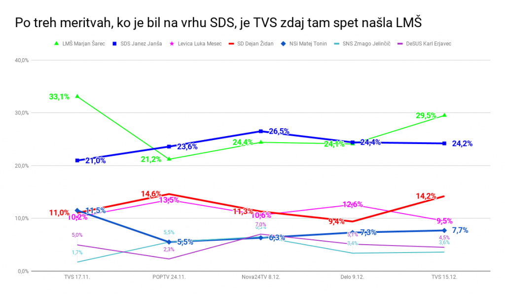 Raziskava Ninamedie za TVS je po treh zaporednih meritvah, v katerih je vodila SDS Janeza Janše, na vrh spet vrnila LMŠ Marjana Šarca. SDS je vodila po raziskavah, ki so jih objavili po Mediani POPTV, po Parsifali Nova24 in po Mediani Delo. A prednost SDS ni bila velika. Po TVS, rezultate iste raziskave objavita še združujoča se Dnevnik in Večer, pa je prednost LMŠ pred SDS velika. In to ni nekaj novega, vedno je tako.