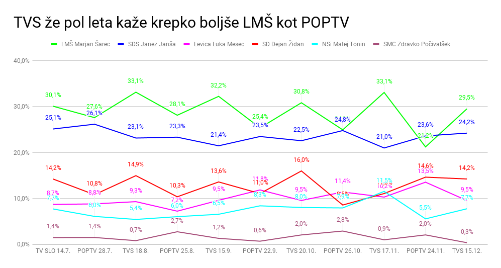 Je pa med POPTV in TVS zadnji mesec spet podoben vrstni red vsaj na tretjem in četrtem mestu. Tretja je SD Dejana Židana, četrta Levica Luke Meseca.