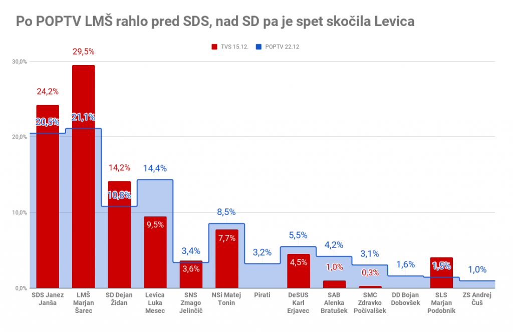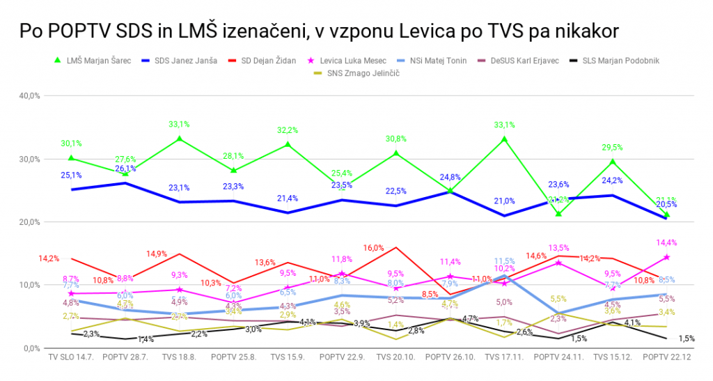 Levica Luke Meseca je krepko prehitela SD Dejana Židana, LMŠ Marjana Šarca pa je povsem na vrhu rahlo pred SDS Janeza Janše. To je pokazala raziskave Mediane, katere rezultate je včeraj objavila POPTV.