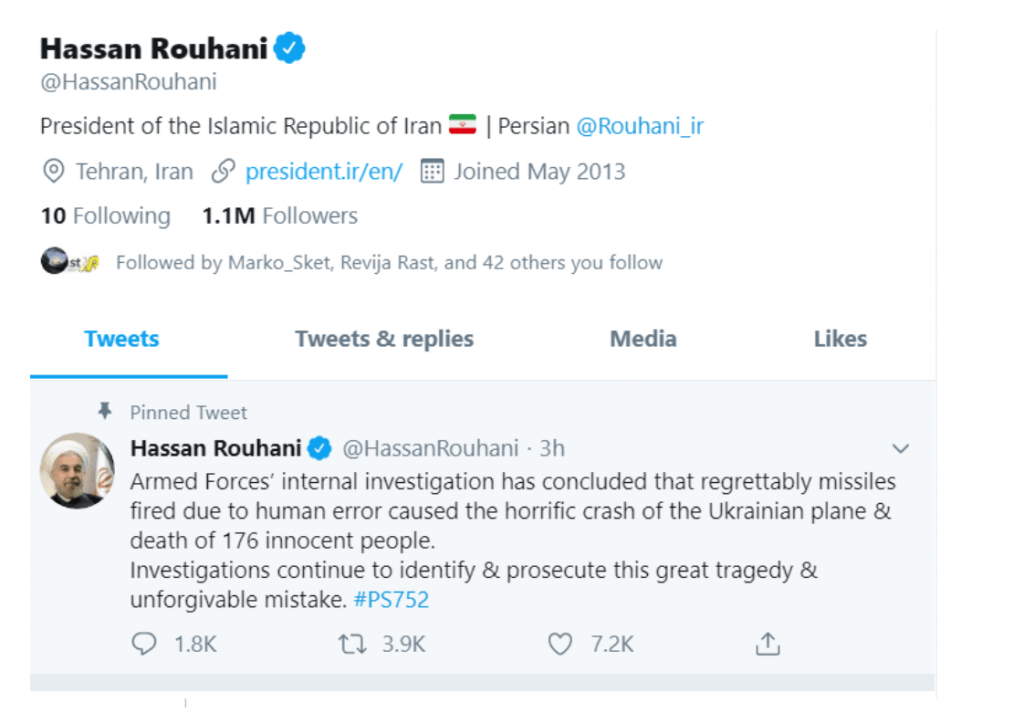 Predsednik islamske republike Hassan Rouhani je sestrelitev priznal tako: