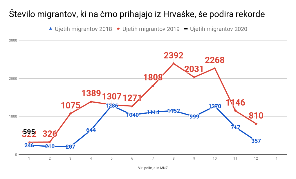 Strmi rasti števila migrantov, ki prihajajo čez slabo zavarovano mejo s Hrvaško, smo bili priča tudi januarja, kaže poročilo policije o tem, koliko migrantov so ujeli januarja letos. Januarja 2018 so jih ujeli 246, lani 322, letos 595.