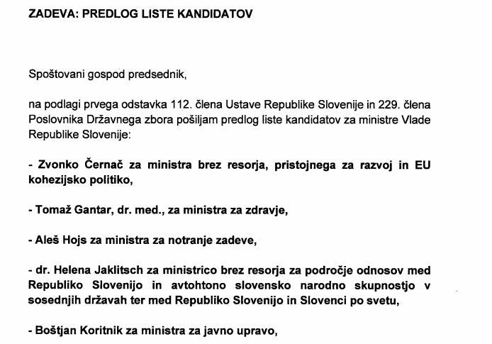 Premier Janez Janša (SDS) je državnemu zboru nocoj predlagal listo kandidatov za ministre.