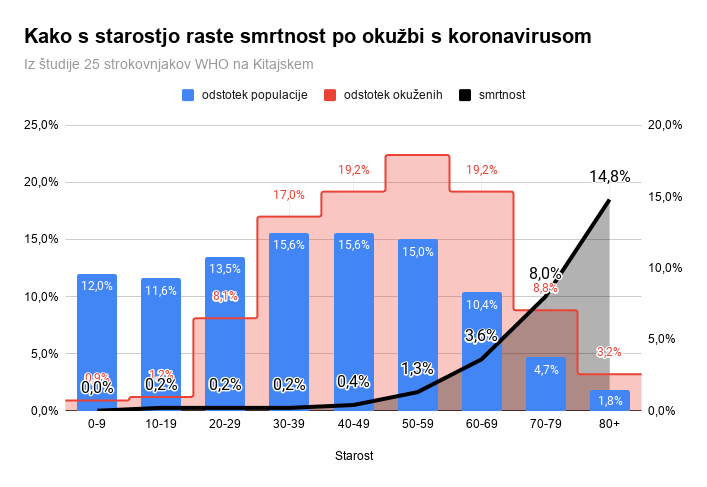 Po izkušnjah na Kitajskem koronavirus bolj ogroža moške. Umrlo je prve mesece 2,8 odstotka žensk in 4,7 odstotka okuženih moških. Kako zelo smrtnost raste s starostjo, ko imajo ljudje tudi več drugih bolezni, pa kaže ta grafika, ki je narejena po podatkih teh raziskovalcev WHO: