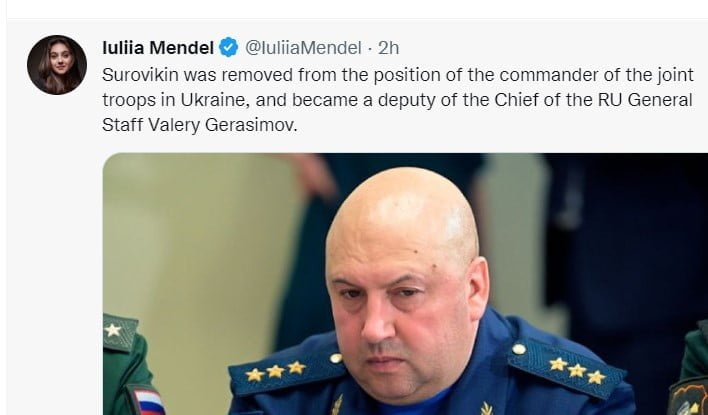 Ruski predsednik Vladimir Putin je odstavil Sergeja Surovikina po vsega treh mesecih, kar je ta prevzel vodenje vojaškega napada Rusije na Ukrajino. Pred tem skupnega poveljevanja okupatorske vojske v Ukrajini ni bilo. Vodenje prevzema general Valerij Gerasimov, je sporočilo rusko obrambno ministrstvo. V zadnjih mesecih je Rusija na bojiščih doživljala neuspehe. V času Surovikina se je morala umakniti iz območja edine regionalne prestolnice, ki so jo zasedli po napadu na Ukrajino, iz Hersona. Ukrajinci pa so rusko vodenje vojske večkrat tudi ponižali, denimo s preciznim raketiranjem velikega števila ruskih vojakov, ki so se zbirali v stavbah blizu fronte, v katerih je bilo tudi razstrelivo. Iz Ruske strani so trdili, da so z raketnimi napadi Ukrajincem to vrnili s podobnimi napadi, a preverjanja medijev so pokazala, da je šlo za neresnične trditve propagandne vrste.