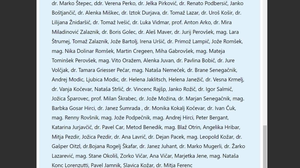 dr. Marko Štepec, ddr. Verena Perko, dr. Jelka Pirkovič, dr. Renato Podbersič, Janko Boštjančič, dr. Alenka Miškec, dr. Iztok Durjava, dr. Tomaž Lazar, dr. Uroš Košir, dr. Lilijana Žnidaršič, dr. Tomaž Ivešić, dr. Luka Vidmar, prof. Anton Arko, dr. Mira Miladinović Zalaznik, dr. Boris Golec, dr. Aleš Maver, dr. Jurij Perovšek, mag. Lara Štrumej, Tomaž Zalaznik, Jože Bartolj, Irena Uršič, dr. Primož Lampič, Jože Romšek, mag. Nika Dolinar Romšek, Martin Cregeen, Miha Gabrovšek, mag. Mateja Tominšek Perovšek, mag. Vito Oražem, Alenka Juvan, dr. Pavlina Bobič, dr. Jure Volčjak, dr. Tamara Griesser Pečar, mag. Nataša Nemeček, dr. Brane Senegačnik, Andrej Modic, Ljubica Modic, dr. Helena Jaklitsch, Helena Janežič, dr. Vesna Krmelj, dr. Vanja Kočevar, Nataša Strlič, dr. Vincenc Rajšp, Janko Rožič, dr. Igor Salmič, Jožica Šparovec, prof. Milan Škrabec, dr. Jože Možina, dr. Marjan Senegačnik, mag. Barbka Gosar Hirci, dr. Janez Šumrada, dr. Monika Kokalj Kočevar, dr. Ivan Čuk, mag. Renny Rovšnik, mag. Jože Podpečnik, mag. Andrej Hirci, Peter Bergant, Katarina Jurjavčič, dr. Pavel Car, Metod Benedik, mag. Blaž Otrin, Angelika Hribar, Mitja Pezdir, Jožica Pezdir, dr. Ana Lavrič, dr. Dejan Pacek, mag. Leopold Kožar, dr. Gašper Oitzl, dr. Bojana Rogelj Škafar, dr. Janez Juhant, dr. Marko Mugerli, dr. Žarko Lazarević, mag. Stane Okoliš, Zorko Vičar, Ana Vičar, Marjetka Jene, mag. Nataša Konc Lorenzutti, Pavel Jamnik, Slavica Kožar, dr. Mitja Ferenc.
