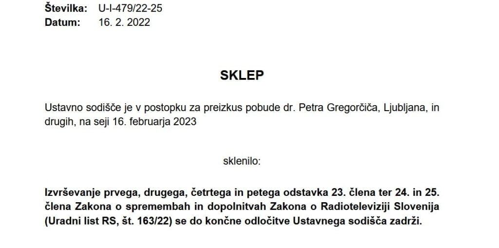 Ustavno sodišče je objavilo sklep, da ne bo takojšnje odstavitve najpomembnejših direktorjev in vseh nadzornikov in programskih svetnikov na RTV Slovenija, dokler ne presodijo ustavnosti. Odstavitve so vladajoči uzakonili, da bi vladajoča koalicija Roberta Goloba lahko nastavila svoje kadre.