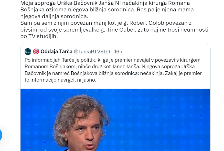 Zdaj so podobno iz Gibanja svoboda razširili, da bi naj bil vrhunski kirurg Bošnjak v sorodstvu s soprogo Janeza Janše. S pojasnjevanjem težav z nenavadnim plačilom morebitno sorodstvo nima povezave. Razen, da se ustvari tak vtis z umazano medijsko propagando. Povrhu je sorodstvena vez celo izmišljotina.