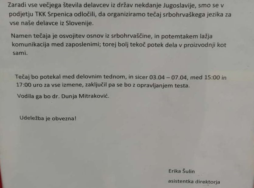 Danes zjutraj smo bili obveščeni, da na spletnih omrežjih kroži dopis, v katerem podjetje TKK organizira obvezen tečaj srbohrvaškega jezika.