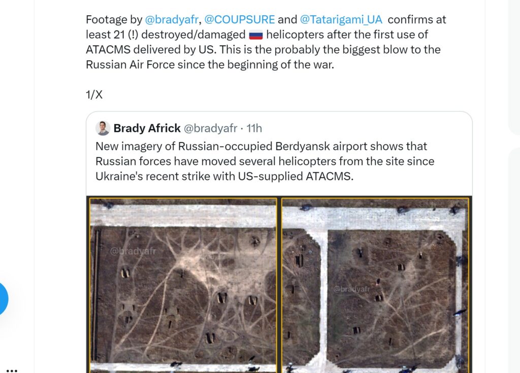 Pri helikopterjih je ukrajinska vojska doslej objavila zadržane ocene, da bi naj bilo z napadi z ATACMS zanesljivo uničenih šest in še nekaj poškodovanih, je pa mogoče najti tudi ocene o enaindvajset onesposobljenih helikopterjih. Seveda pa na območju napadov niso bili uničeni le helikopterji.