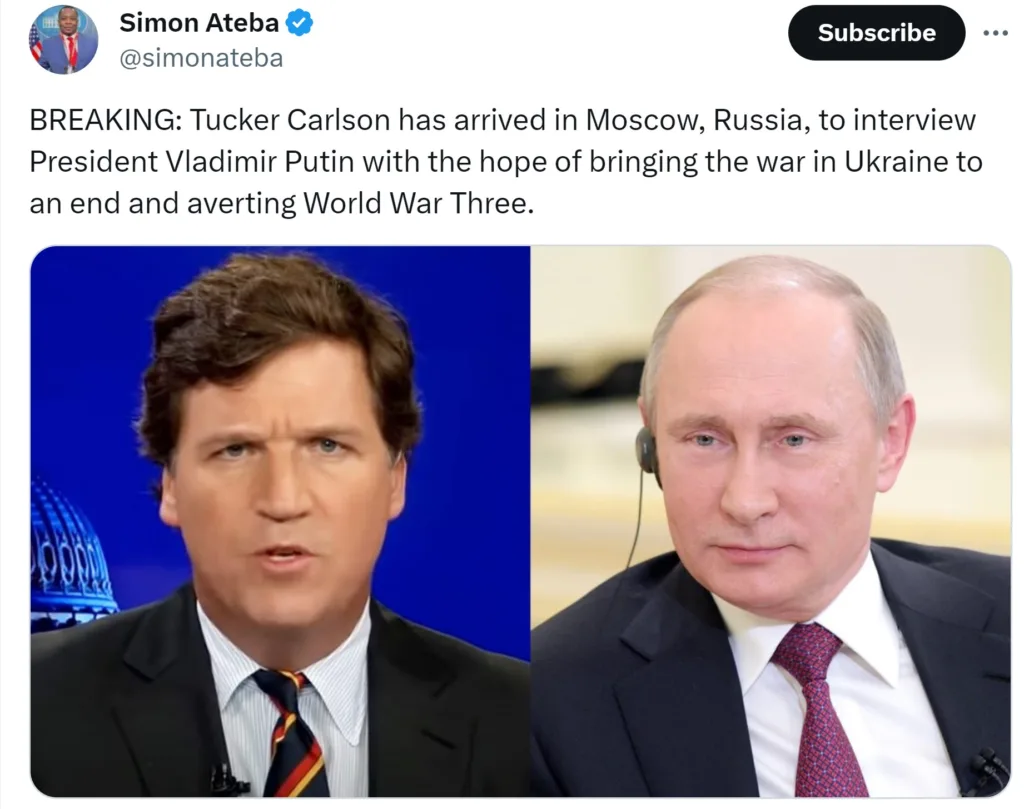 Tucker Carlson, ki so mu na Fox News aprila lani ukinili najbolj gledan šov v ZDA, v katerem je slovel tudi po tem, da je občasno širil prozorne ruske teorije zarote o razlogih za napad na Ukrajino in okupaciji delov te države, bi naj pripotoval v Moskvo, kjer bi naj nameraval narediti celo intervju z Vladimirjem Putinom. Informacije o tem so preplavile spletna omrežja v Rusiji, Ukrajini, o tem, da bi bil Carlson lahko v Rusiji s tem ciljem, pa poročajo tudi bolj resni zahodni mediji, denimo Politico.