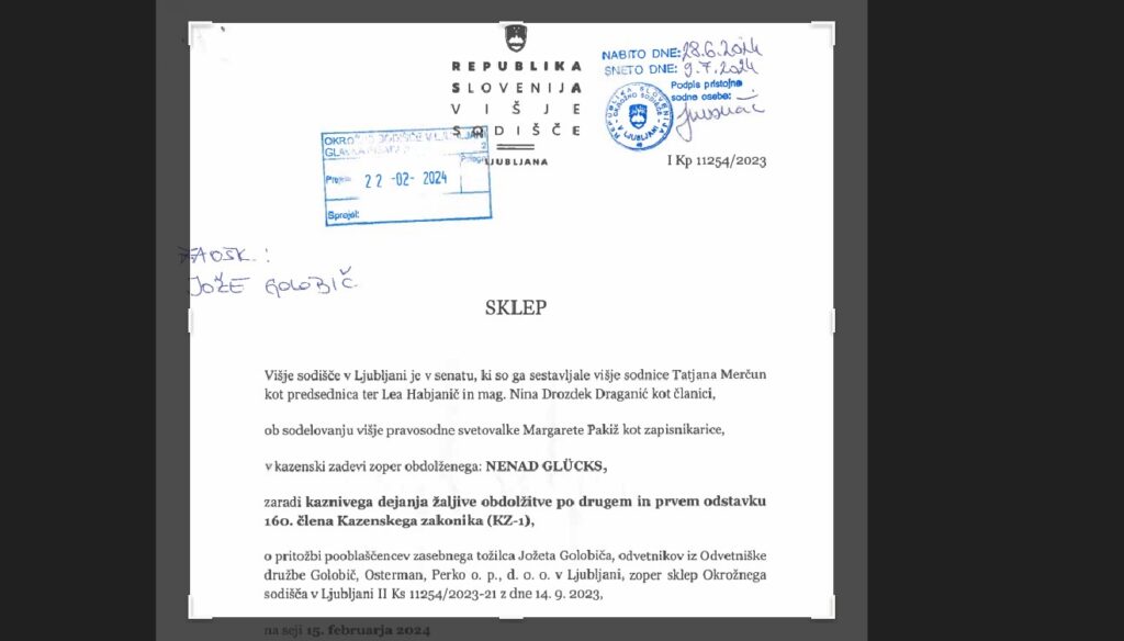 Novinarju Nenada Glücksu ne bo treba v zapor, ker je poročal o zapletih v energetski sanaciji Univerzitetnega kliničnega centra (UKC). Kazenski pregon zaradi članka v reviji Reporter je spodletel nekdanjemu direktorju UKC Jožetu Golobiču. Sklep višjega sodišča o tem, ki je bil sicer sprejet že februarja, je zdaj tudi javno objavljen. Sodnice Tatjana Merčun, Lea Habjanič in Nina Drozdek Draganić so odločile, da ni bilo kaznivega dejanja žaljive obdolžitve. Namesto odškodnine ali zaporne kazni novinarju so Golobiču naložile plačilo 360 evrov stroškov pritožbenega postopka.