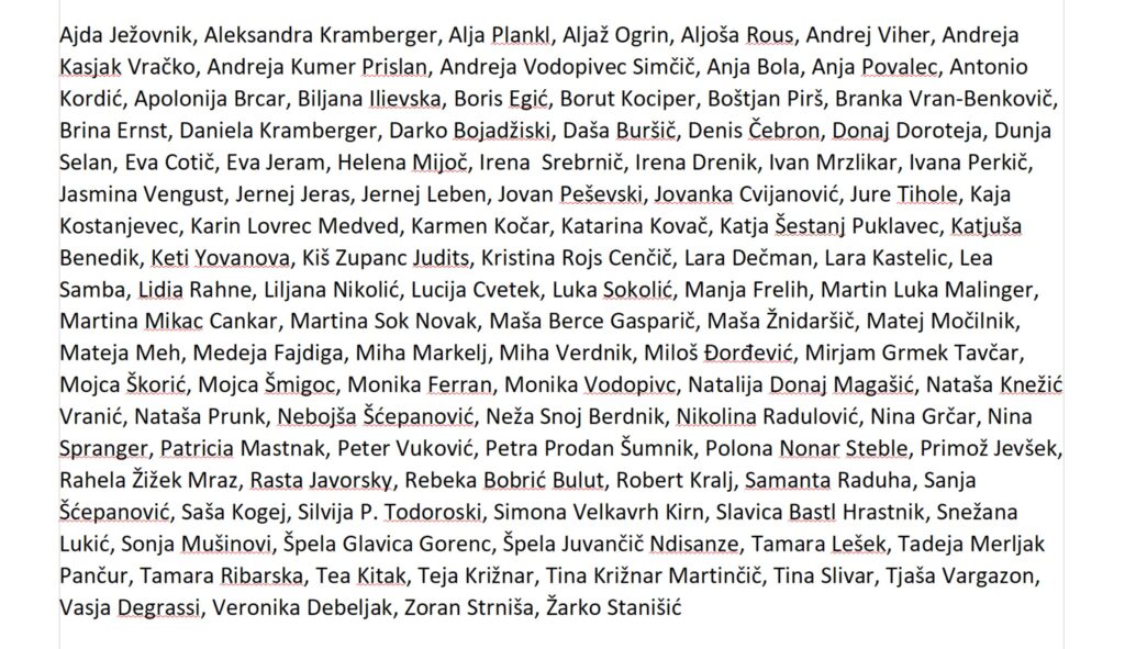 Ajda Ježovnik, Aleksandra Kramberger, Alja Plankl, Aljaž Ogrin, Aljoša Rous, Andrej Viher, Andreja Kasjak Vračko, Andreja Kumer Prislan, Andreja Vodopivec Simčič, Anja Bola, Anja Povalec, Antonio Kordić, Apolonija Brcar, Biljana Ilievska, Boris Egić, Borut Kociper, Boštjan Pirš, Branka Vran-Benkovič, Brina Ernst, Daniela Kramberger, Darko Bojadžiski, Daša Buršič, Denis Čebron, Donaj Doroteja, Dunja Selan, Eva Cotič, Eva Jeram, Helena Mijoč, Irena Srebrnič, Irena Drenik, Ivan Mrzlikar, Ivana Perkič, Jasmina Vengust, Jernej Jeras, Jernej Leben, Jovan Peševski, Jovanka Cvijanović, Jure Tihole, Kaja Kostanjevec, Karin Lovrec Medved, Karmen Kočar, Katarina Kovač, Katja Šestanj Puklavec, Katjuša Benedik, Keti Yovanova, Kiš Zupanc Judits, Kristina Rojs Cenčič, Lara Dečman, Lara Kastelic, Lea Samba, Lidia Rahne, Liljana Nikolić, Lucija Cvetek, Luka Sokolić, Manja Frelih, Martin Luka Malinger, Martina Mikac Cankar, Martina Sok Novak, Maša Berce Gasparič, Maša Žnidaršič, Matej Močilnik, Mateja Meh, Medeja Fajdiga, Miha Markelj, Miha Verdnik, Miloš Ðorđević, Mirjam Grmek Tavčar, Mojca Škorić, Mojca Šmigoc, Monika Ferran, Monika Vodopivc, Natalija Donaj Magašić, Nataša Knežić Vranić, Nataša Prunk, Nebojša Šćepanović, Neža Snoj Berdnik, Nikolina Radulović, Nina Grčar, Nina Spranger, Patricia Mastnak, Peter Vuković, Petra Prodan Šumnik, Polona Nonar Steble, Primož Jevšek, Rahela Žižek Mraz, Rasta Javorsky, Rebeka Bobrić Bulut, Robert Kralj, Samanta Raduha, Sanja Šćepanović, Saša Kogej, Silvija P. Todoroski, Simona Velkavrh Kirn, Slavica Bastl Hrastnik, Snežana Lukić, Sonja Mušinovi, Špela Glavica Gorenc, Špela Juvančič Ndisanze, Tamara Lešek, Tadeja Merljak Pančur, Tamara Ribarska, Tea Kitak, Teja Križnar, Tina Križnar Martinčič, Tina Slivar, Tjaša Vargazon, Vasja Degrassi, Veronika Debeljak, Zoran Strniša, Žarko Stanišić