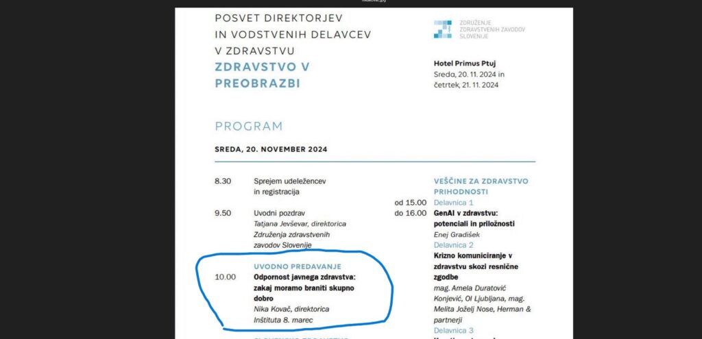 Znana borka za poplave čiste vode Nika Kovač, ki je tudi šefica sveta premiera Roberta Goloba za sovražni govor, ki je bil ustanovljen po pozivih k smrti političnih nasprotnikov na protestih, ki jih je Kovačeva pomagala organizirati, je tudi vrhunski strokovnjak za reševanje javnega zdravstva. Na letošnjem posvetu direktorjev in vodstvenih delavcev v zdravstvu, ki si jih je z nujno politično čistko ministra Danijela Bešiča Loredana nastavila Svoboda, bo direktorica zasebnega zavoda 8. marec imela uvodno predavanje o odpornosti javnega zdravstva. Na vrsti bo s svojim strokovnim znanjem celo pred ministrico Valentino Prevolnik Rupel, ki je na področju zdravstva v primerjavi s Kovačevo še začetnica.