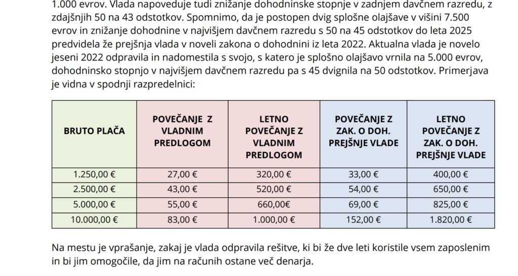 Vlada napoveduje, da bo sredstva, zbrana z novim nepremičninskim davkom, namenila za razbremenitev dela. Pri tem v predstavljenih izhodiščih posebej meri na srednji in višji razred. Posebna osebna davčna olajšava v dodatni višini 2.000 evrov letno (kar bi skupno olajšavo z zdajšnjih 5.000 evrov dvignilo na 7.000 evrov letno) naj bi zaposlenemu z minimalno plačo na letni ravni prinesla dodatnih 320 evrov, s povprečno plačo 520 evrov in tistim v najvišjem razredu 1.000 evrov. Vlada napoveduje tudi znižanje dohodninske stopnje v zadnjem davčnem razredu, z zdajšnjih 50 na 43 odstotkov. Spomnimo, da je postopen dvig splošne olajšave v višini 7.500 evrov in znižanje dohodnine v najvišjem davčnem razredu s 50 na 45 odstotkov do leta 2025 predvidela že prejšnja vlada v noveli zakona o dohodnini iz leta 2022. Aktualna vlada je novelo jeseni 2022 odpravila in nadomestila s svojo, s katero je splošno olajšavo vrnila na 5.000 evrov, dohodninsko stopnjo v najvišjem davčnem razredu pa s 45 dvignila na 50 odstotkov. Primerjava je vidna v spodnji razpredelnici: