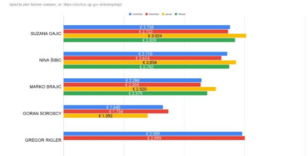 Razkrivam neto plače petih uslužbencev MOL. Novembra lani je najvišje neto izplačilo 10.149, januarja letos 13.687 in februarja 4.382 evrov.