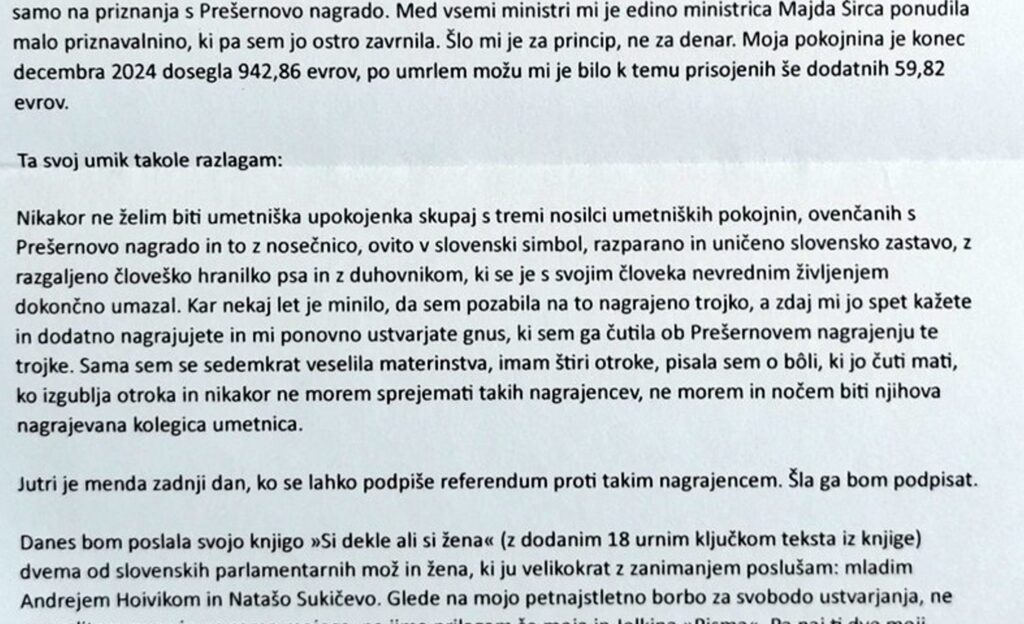 “Ne želim biti umetniška upokojenka s tremi nosilci umetniških pokojnin, ovenčanih s Prešernovo nagrado in to z nosečnico ovito v slovenski simbol, razparano in uničeno slovensko zastavo, z razgaljeno človeško hranilko psa in duhovnikom, ki se je s svojim človeka nevrednim življenjem dokončno umazal.” S to razlago se je s pismom Asti Vrečko zahtevi za umetniško pokojnino odrekla verjetno najbolj preganjanja in cenzurirana pisateljica novejše slovenske zgodovine Breda Smolnikar. Na posnetku je Asta Vrečko na prireditvi Slovenka leta medijskega tajkuna Martina Odlazka, kjer je bila s premierom Robertom Golobom: